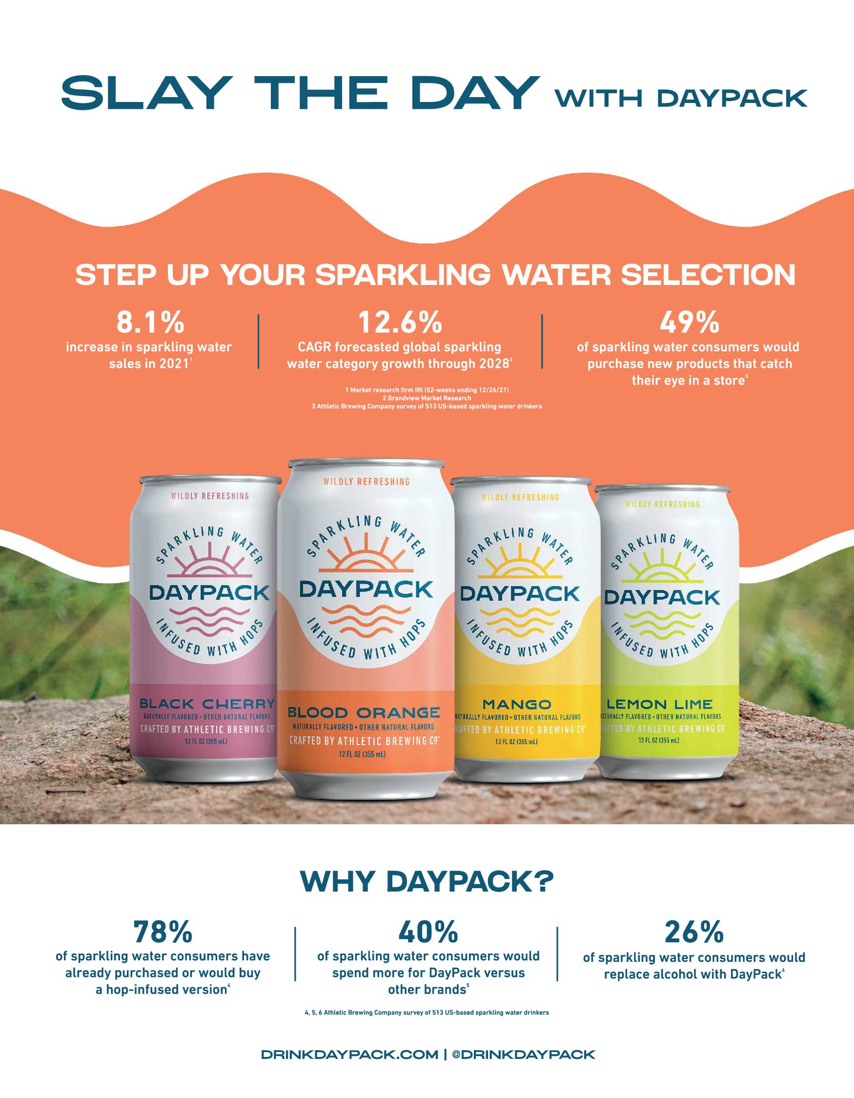 Blood Orange Crisp, clean and citrusy, Blood Orange DayPack is a fan favorite. Chinook hops highlight the acidic side of the citrus fruit, providing 12 ounces of untamed tang. DayPack is vegan, non-GMO, gluten-free, naturally calorie-free, and naturally sodium-free.